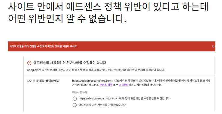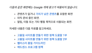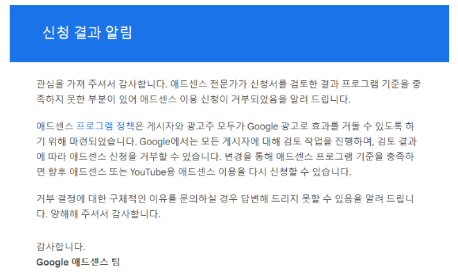 - 사유 설명: 애드센스 코드가 삽입되지 않았거나 사이트 소유권을 증명하지 못한 경우.