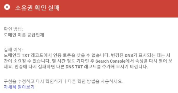 ✅ 4. 도메인 소유권 확인 실패